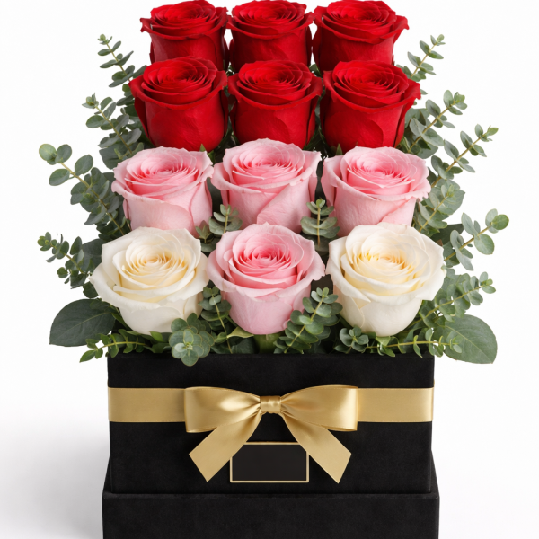 Caja Negra con Rosas Rojas y Blancas
