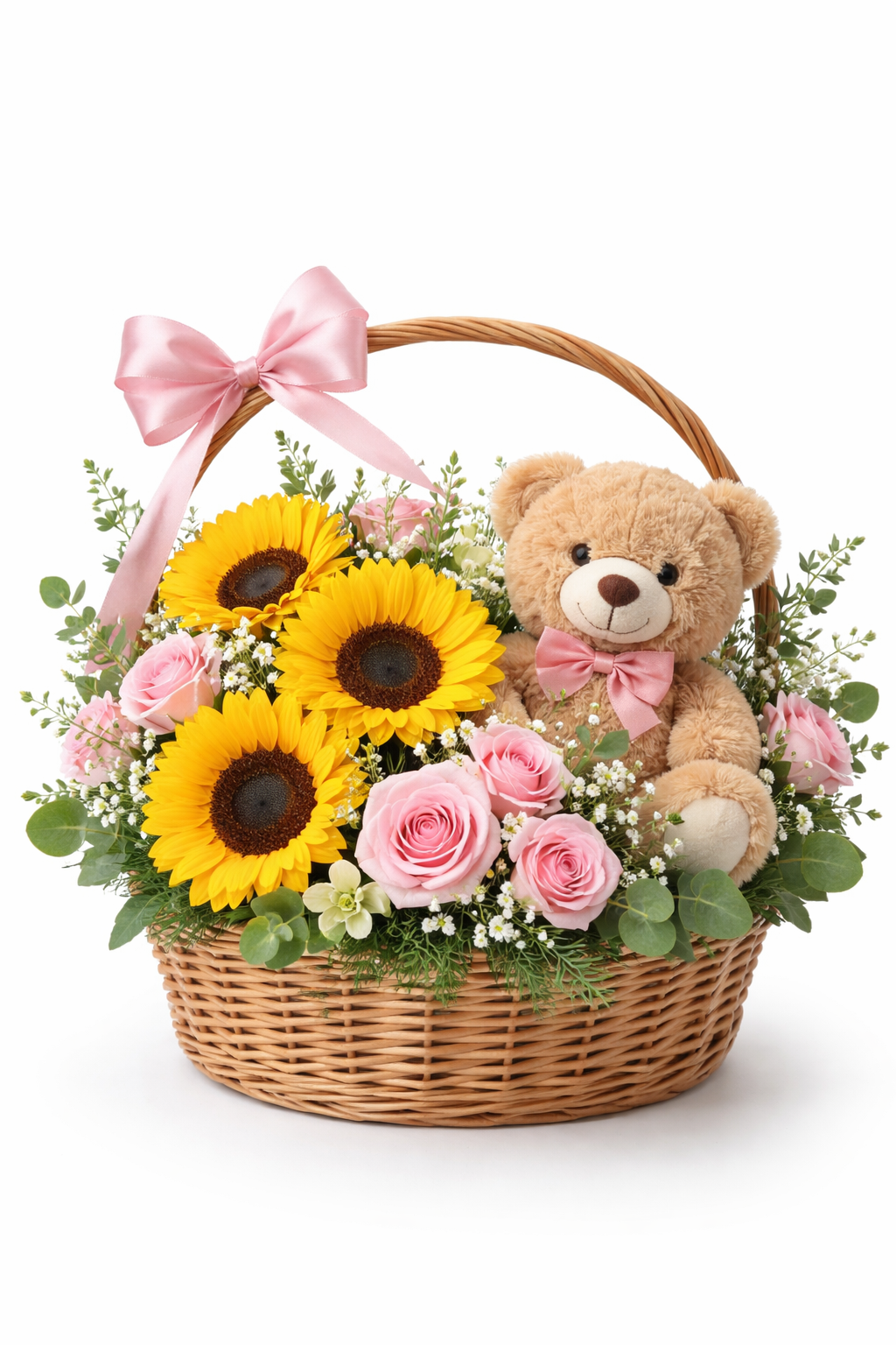 Elegante cesta decorativa sobre fondo blanco que combina la calidez de los girasoles con la delicadeza de las rosas rosadas. El arreglo incluye follajes verdes que aportan frescura y volumen, creando un contraste natural y armonioso. En el centro, un suave peluche añade un toque tierno y especial, perfecto para regalar en ocasiones significativas. Un diseño equilibrado, luminoso y lleno de vida, ideal para transmitir cariño y alegría.