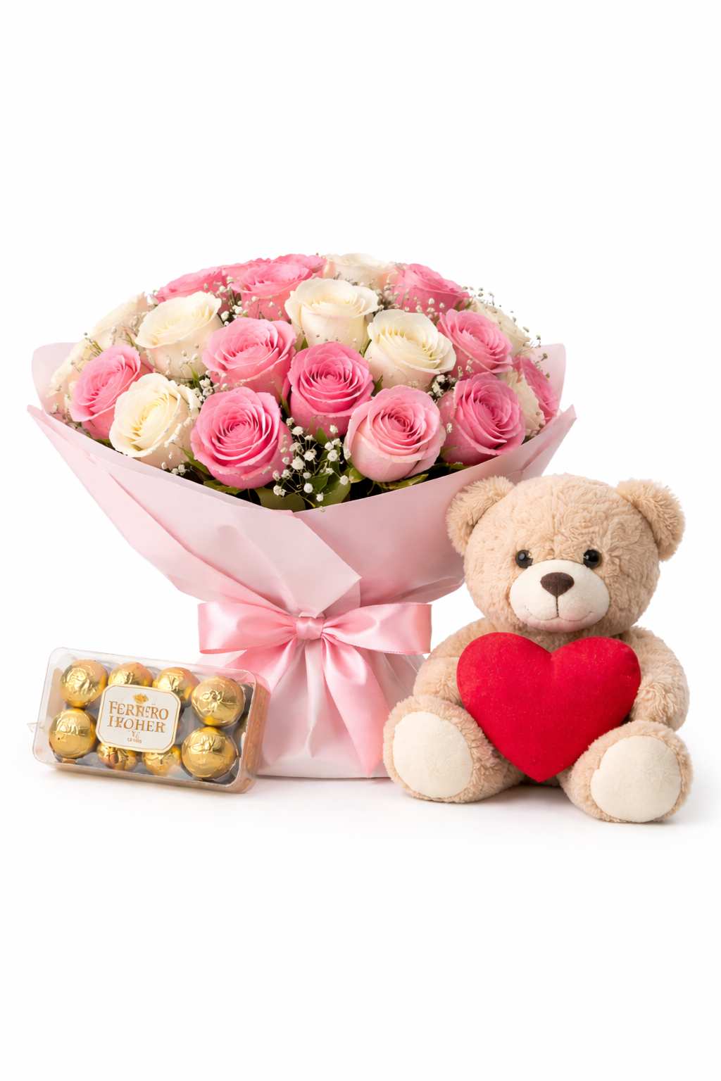 Hermoso ramillete compuesto por 24 rosas en tonos rosados y blancos, cuidadosamente seleccionadas para transmitir dulzura, elegancia y cariño. Este arreglo se complementa con una deliciosa caja de 8 chocolates Ferrero Rocher, aportando un toque especial y sofisticado al regalo.