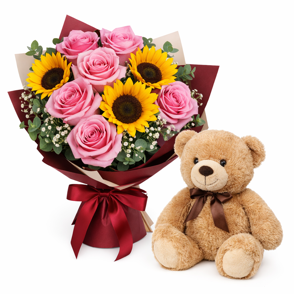 Llena de luz y ternura cualquier momento especial con este encantador arreglo que combina la energía vibrante de los girasoles con la delicadeza de las rosas rosadas. Acompañado de un suave peluche, este detalle transmite alegría, cariño y dulzura en cada elemento. Ideal para sorprender en cumpleaños, celebraciones o simplemente para demostrar amor y aprecio de una manera única y memorable.