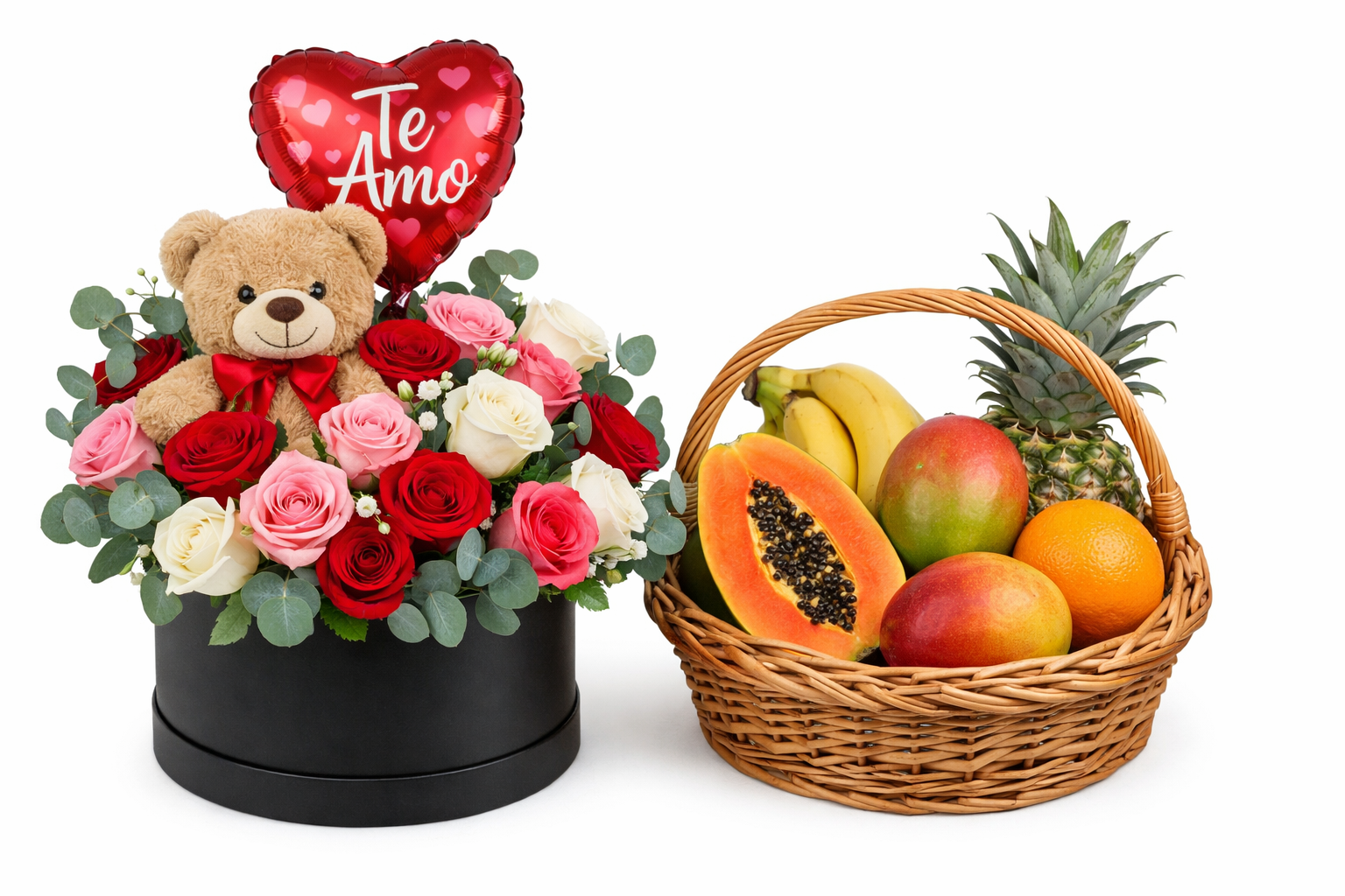 A su lado, una hermosa cesta de frutas frescas cuidadosamente seleccionadas, que incluye papaya, banana, mango, naranja y piña, ofreciendo una combinación perfecta entre dulzura, frescura y presentación premium.