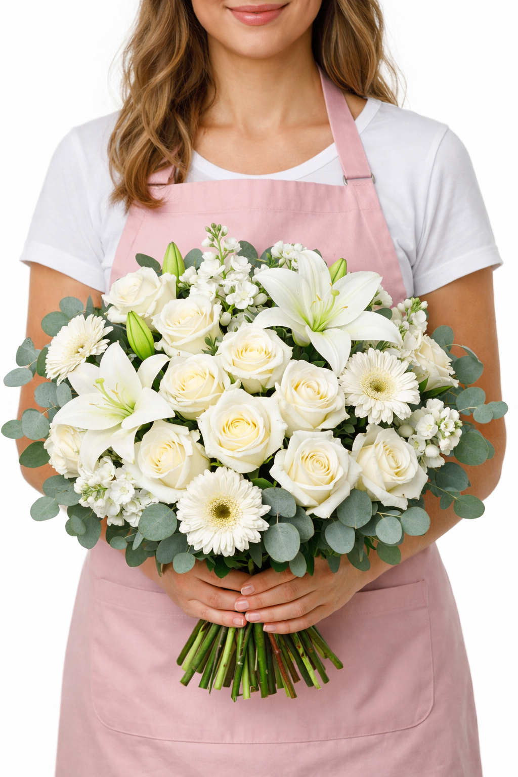 Cada flor ha sido cuidadosamente seleccionada para lograr un equilibrio visual único, resaltando la pureza del color blanco y la textura natural de cada pétalo.