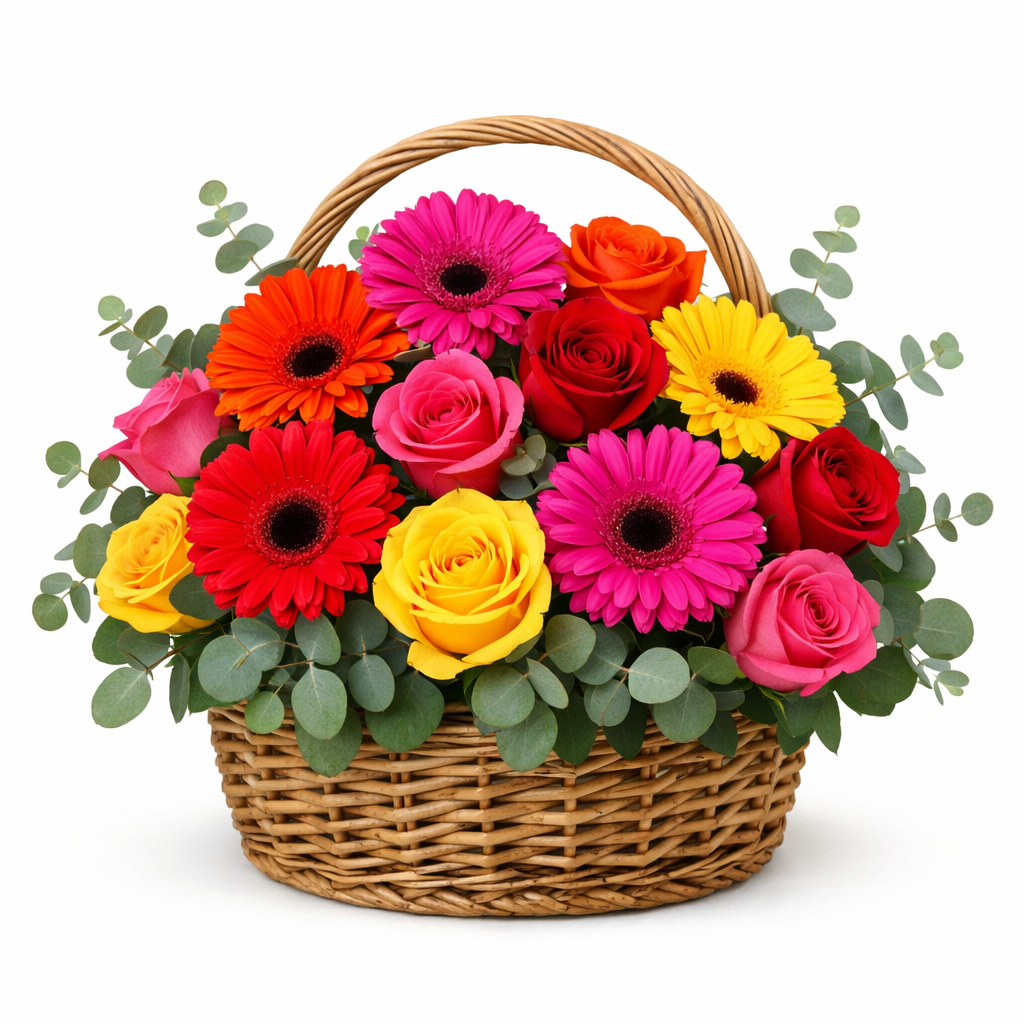 Hermosa cesta floral compuesta por 18 flores cuidadosamente seleccionadas, que combinan la elegancia de las rosas con la frescura y alegría de las gerberas en colores surtidos. Presentada sobre un delicado fondo blanco, este arreglo resalta cada detalle y color, creando un contraste limpio, moderno y muy elegante.