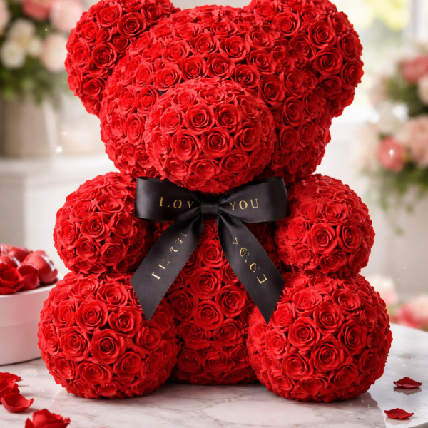 Corazon con rosas rosadas y flores surtidas en colores crema, junto con una botella de Bailyes.