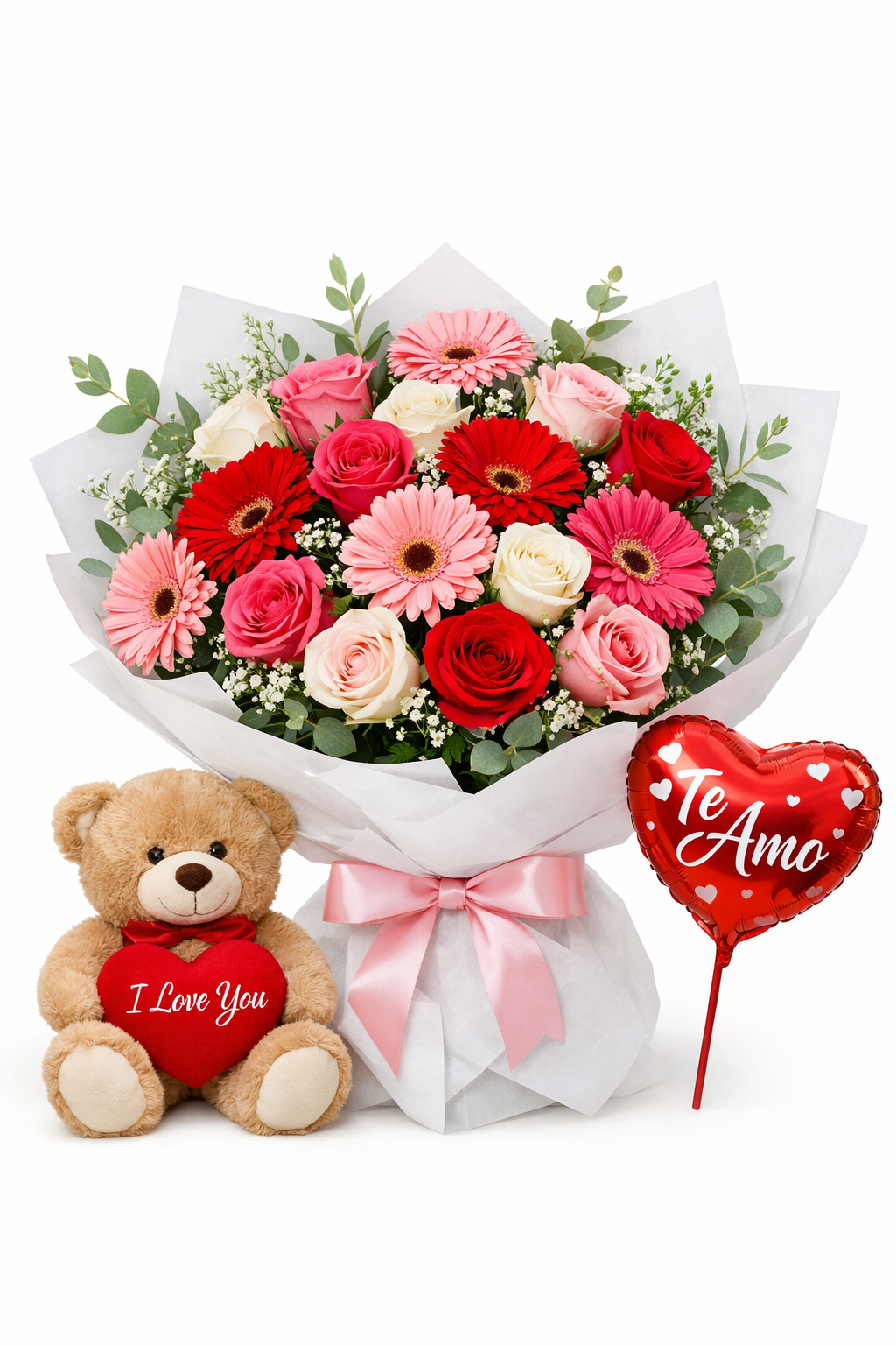 Ramillete de Gerberas y Rosas con Peluche y Globo de Amor