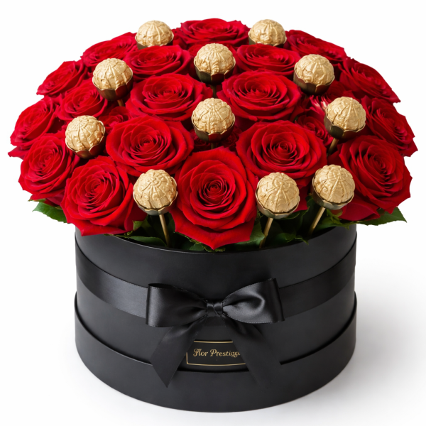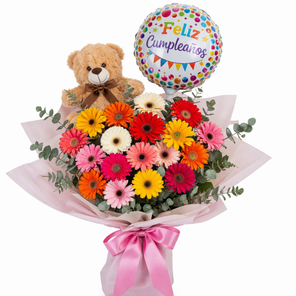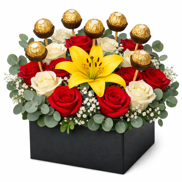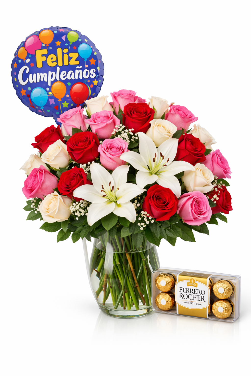 Arreglo floral compuesto por 24 rosas en tonos rosados, rojos y blancos, cuidadosamente dispuestas en un elegante florero. El diseño se complementa con dos lirios que aportan un toque de distinción y frescura. Incluye una caja de chocolates Ferrero Rocher de 8 unidades, perfecta para endulzar la ocasión, y un globo con el mensaje “Feliz Cumpleaños” que añade un detalle festivo. Presentado sobre un fondo blanco que resalta la belleza y los colores del arreglo.