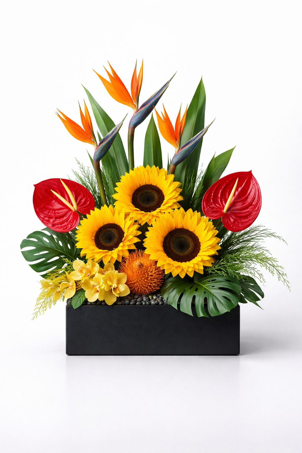 Arreglo floral exótico de estilo minimalista, diseñado en una elegante caja negra de acabado mate. La composición incluye una cuidada selección de flores variadas como girasoles vibrantes, aves del paraíso de líneas sofisticadas y anturios de textura brillante, creando un contraste armonioso entre formas y colores. El diseño destaca por su equilibrio visual y su estética moderna, ideal para ocasiones especiales o decoración contemporánea. Presentado sobre un fondo blanco limpio que resalta la intensidad de los tonos y la estructura del arreglo.