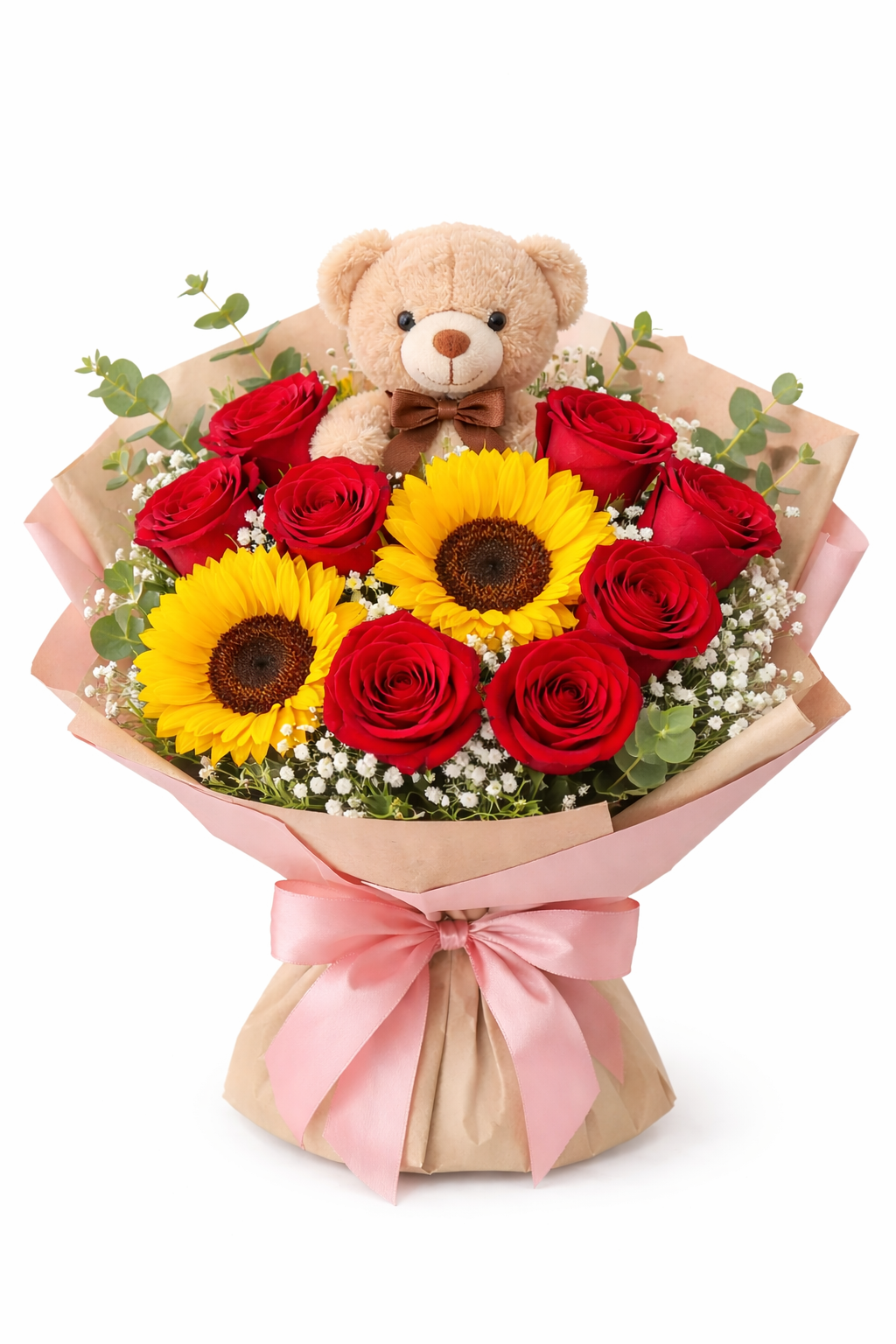 🌹 Ramillete de 12 Rosas con Girasoles y Peluche 🌻🧸