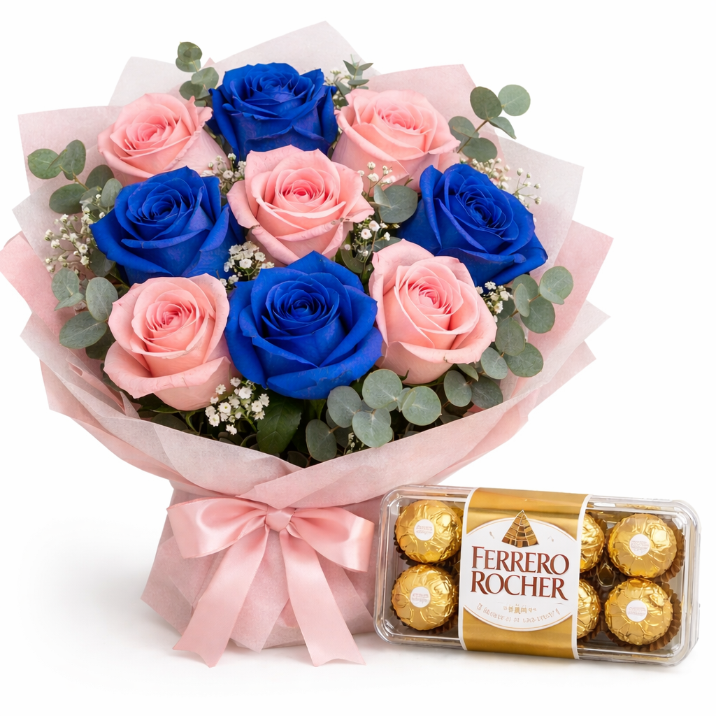 Sorprende con este hermoso arreglo compuesto por 12 rosas cuidadosamente seleccionadas, combinando 6 rosas azules que simbolizan lo extraordinario y lo imposible, junto a 6 rosas rosadas que representan amor, dulzura y admiración.