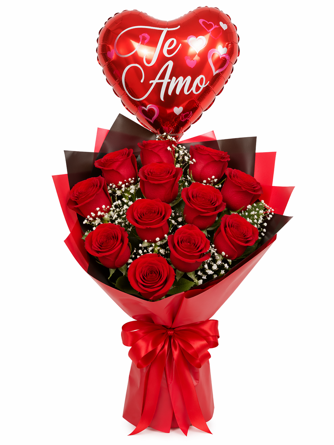 El arreglo se complementa con un delicado globo de amor, que añade un toque moderno y encantador, perfecto para transmitir tus sentimientos de una forma única y memorable.
